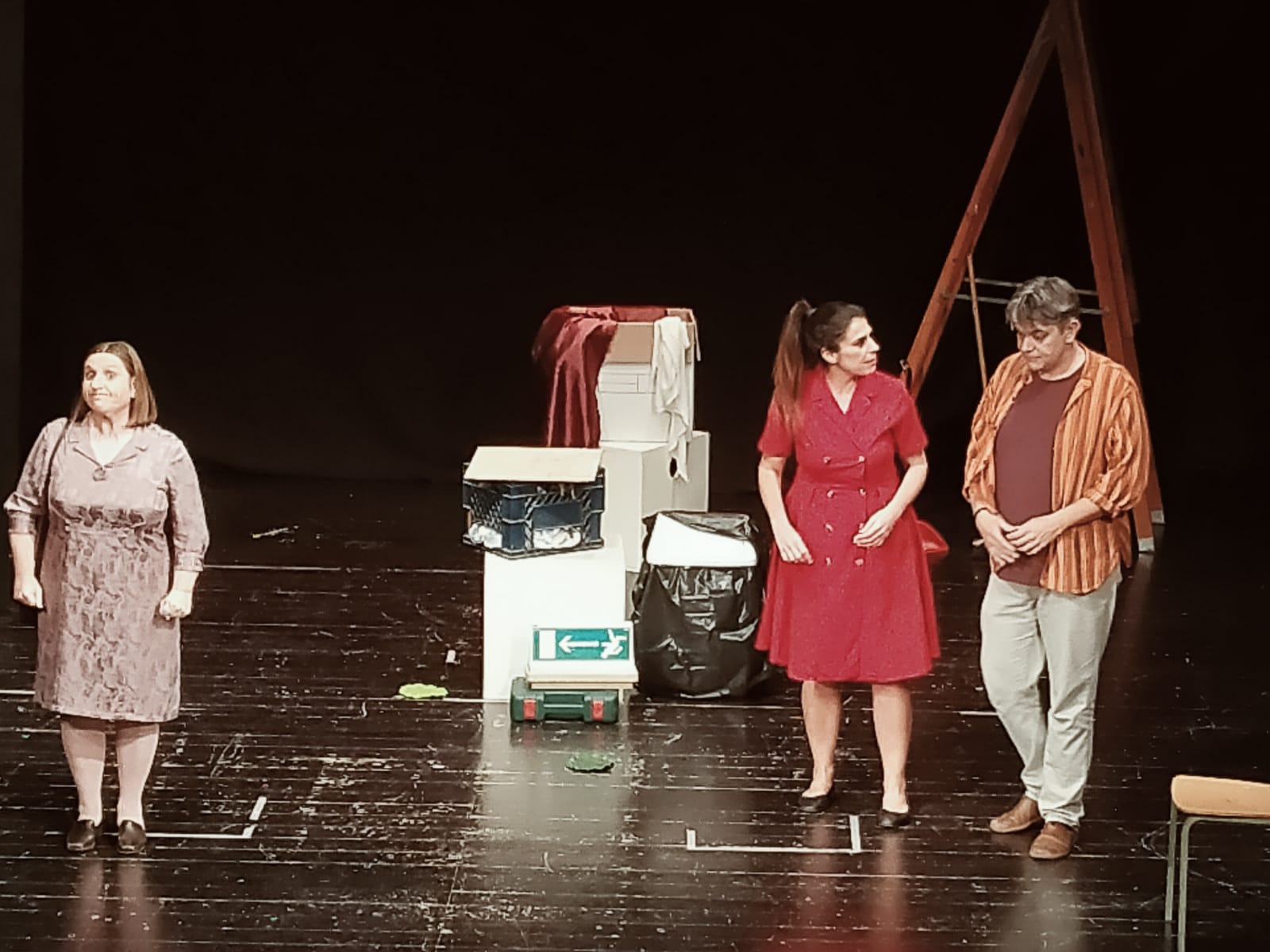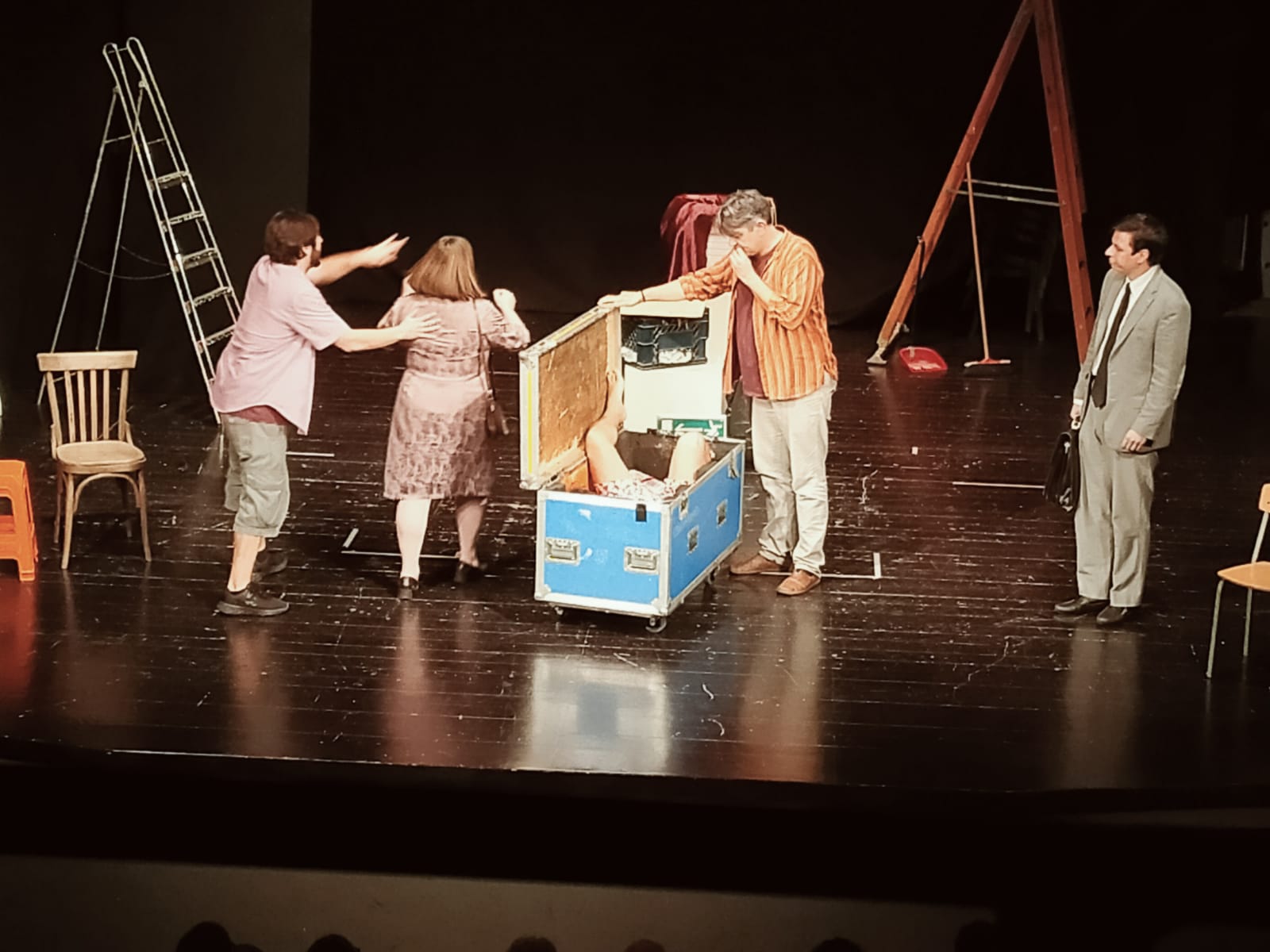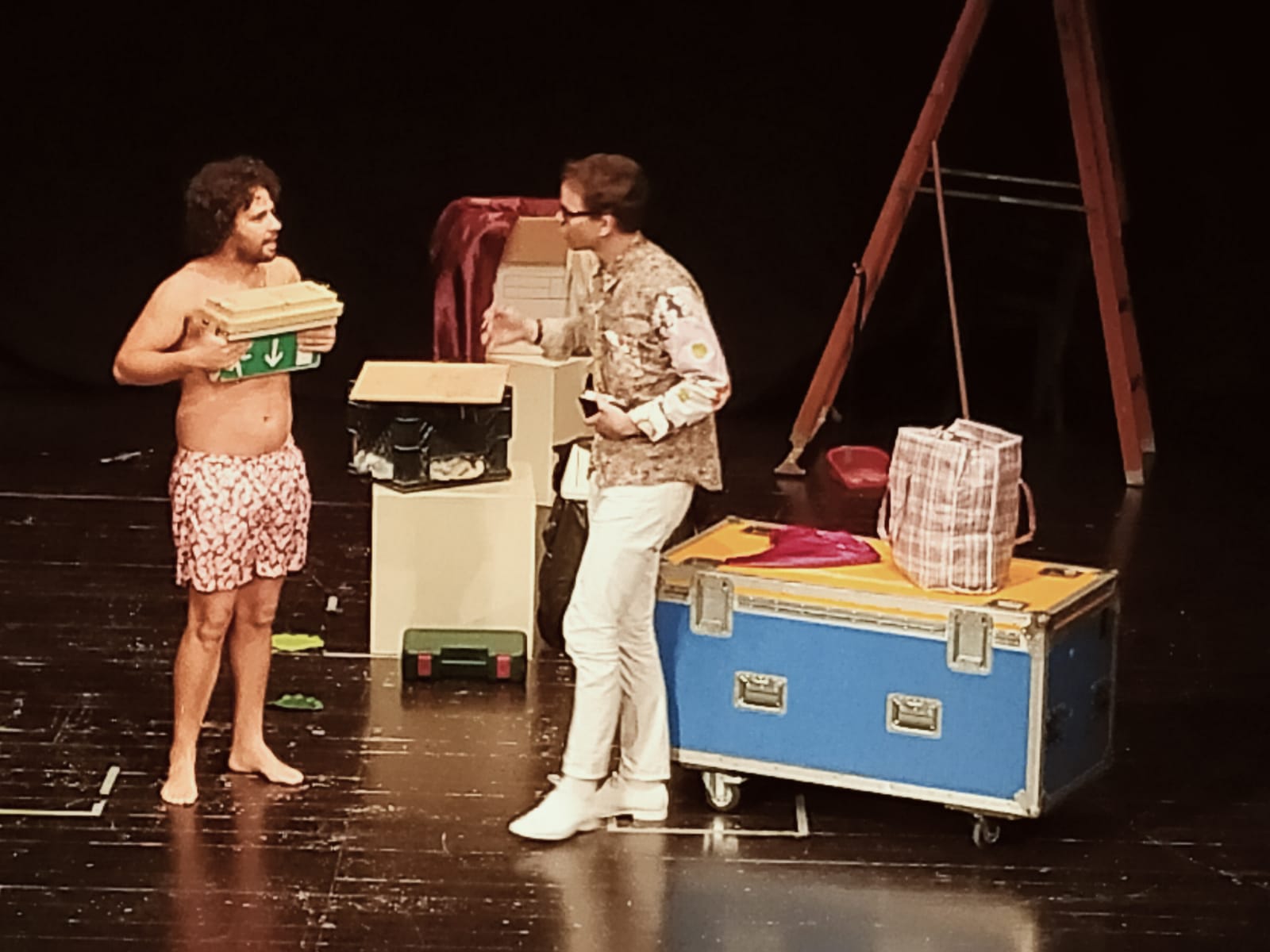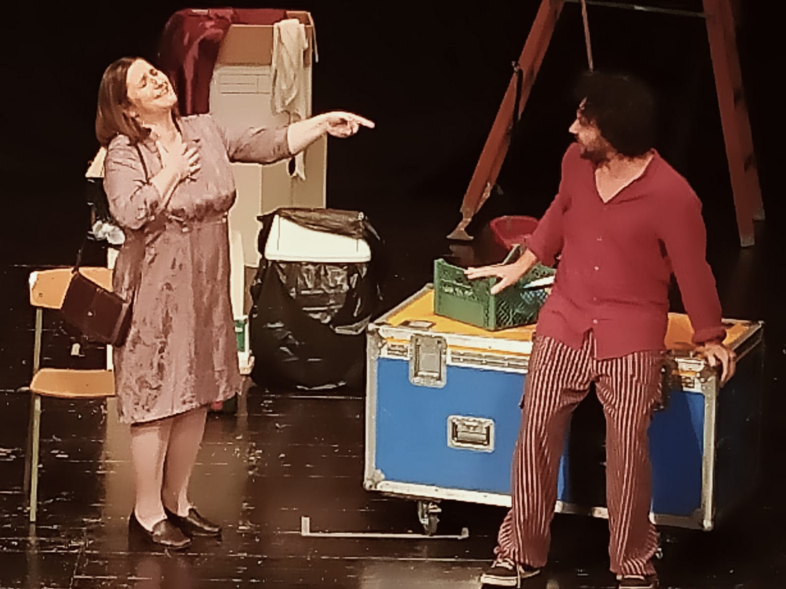 Lo spazio scenico non sarà solo il palcoscenico, essenziale tra cavi, riflettori smontati, scale e tutto ciò che, un teatro fermo da tempo, inevitabilmente accumula. Gli attori invaderanno la platea, la galleria e la sala regìa, spazi questi da cui gli otto attori freneticamente entreranno ed usciranno, regalando al pubblico presente in sala momenti di comicità degni della grande scuola della commedia brillante.