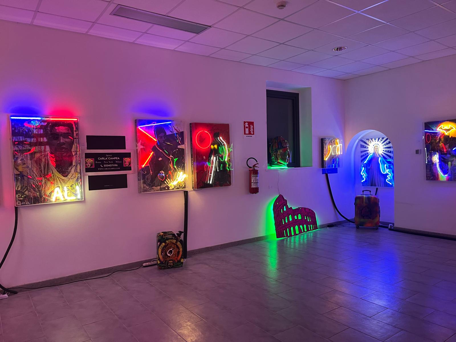 La mostra presenta un corpus di opere che uniscono materiali tradizionali e installazioni luminose, offrendo ai visitatori un viaggio multisensoriale attraverso l’immaginario collettivo reinterpretato. Con il neon come medium principale, Carla Campea esplora temi legati al consumo, alla memoria e alla percezione, trasformando simboli e oggetti di uso quotidiano in creazioni artistiche dal forte impatto visivo.