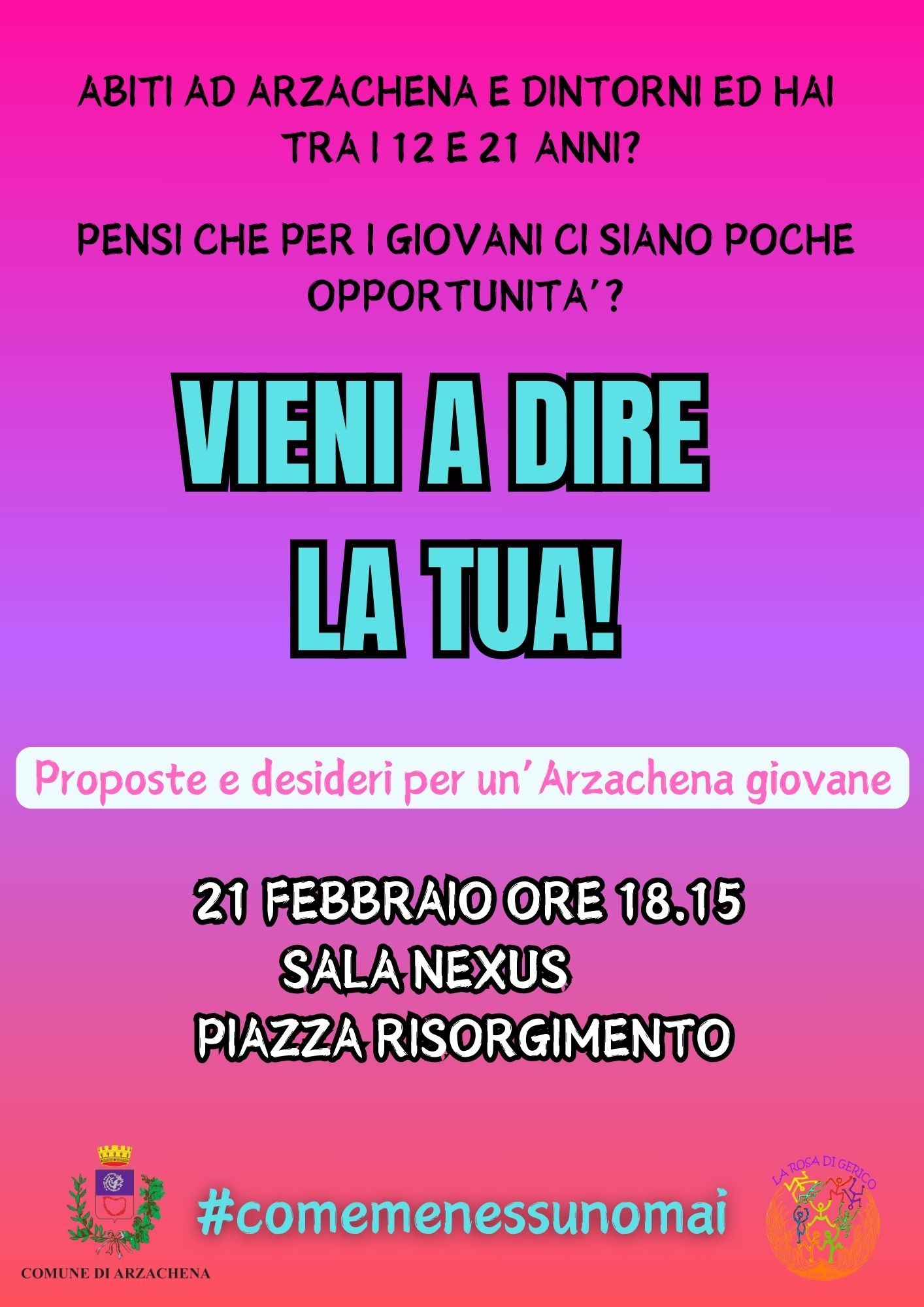 Il primo incontro si terrà il 21 febbraio alle ore 18.15 presso la Sala Nexus, in Piazza Risorgimento, ed è rivolto agli adolescenti di Arzachena. Un’occasione unica per i ragazzi di confrontarsi su ciò che vivono quotidianamente nel loro territorio, esprimendo bisogni, riflessioni e necessità. Non solo un momento di ascolto, ma anche un’opportunità per diventare protagonisti attivi nel cambiamento, partecipando alla creazione di una consulta giovanile che potrà co-progettare insieme all’Amministrazione Comunale e alle realtà sociali e culturali locali. Questo incontro vuole essere il primo passo per un coinvolgimento diretto e costruttivo delle nuove generazioni nella vita della comunità.
