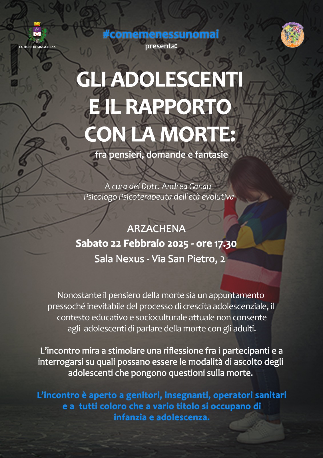 Il secondo incontro, fissato per sabato 22 febbraio alle 17.30 sempre alla Sala Nexus, sarà invece dedicato ai genitori, agli insegnanti e agli operatori sociali che seguono i giovani. Il focus di questo appuntamento si concentrerà su un tema spesso difficile da trattare: il rapporto degli adolescenti con la morte. Un argomento delicato che richiede attenzione e sensibilità, soprattutto quando i ragazzi iniziano a confrontarsi con esperienze dolorose o domande che possono risultare complicate. Il dialogo sarà un’opportunità per esplorare le modalità migliori per ascoltare e sostenere i giovani in momenti così complessi, creando uno spazio di riflessione comune.