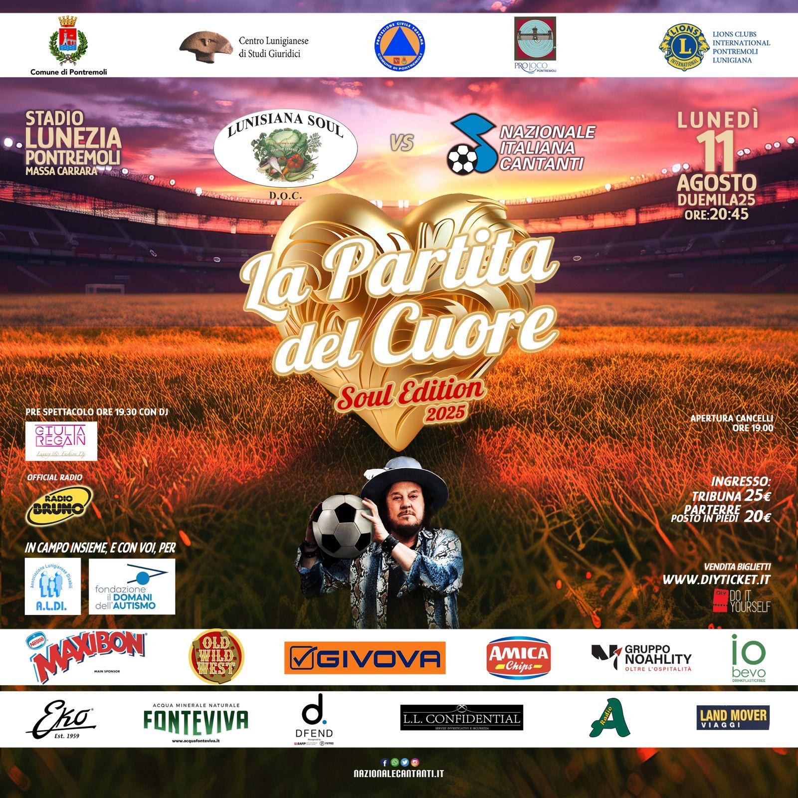 Dopo il successo dell’appuntamento all’Aquila, infatti, la Nazionale Cantanti torna in campo per una serata all’insegna dello sport, della musica e della solidarietà, sfidando la Lunisiana Soul capitanata da Zucchero Fornaciari. Tra i protagonisti già annunciati: Sting, Umberto Tozzi, Enrico Ruggeri, Sal Da Vinci, Moreno e stelle dello sport come Gianluigi Buffon, Claudio Marchisio e Luciano Spalletti.