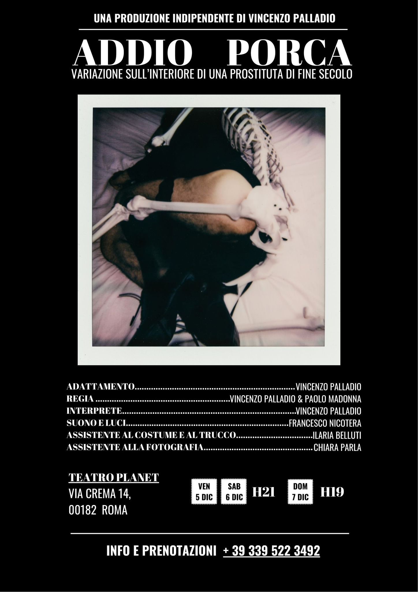 Vincenzo Palladio non è un semplice artista, ma l’arte che prende vita, un creatore a 360 gradi la cui sensibilità si manifesta pienamente in “Addio Porca – Variazione sull’interiore di una prostituta di fine secolo“, andato in scena al Teatro Planet. Palladio firma l’adattamento del testo, la regia e la profonda ricerca dietro l’opera, portandoci nel cuore di una donna di fine Ottocento, la cui storia è un grido lanciato verso l’identità imposta e il giudizio sociale. La sua regia è il punto di forza, non solo inquadrando la scena, ma facendoci sentire le emozioni più intime della protagonista: la solitudine, la lotta e la voglia di riscatto. L’elemento scenico che colpisce è la presenza dello scheletro, un simbolo forte e significativo che non è macabro, ma un mutuo testimone che incarna la fragilità della vita e l’unica verità che resta quando ogni apparenza si sfalda. “Addio Porca” è un’esperienza teatrale di grande impatto, che attesta la statura di Palladio, un artista capace di trattare temi duri con una delicatezza e onestà che rendono questo spettacolo un ritratto commovente e indimenticabile della resilienza dell’animo umano.