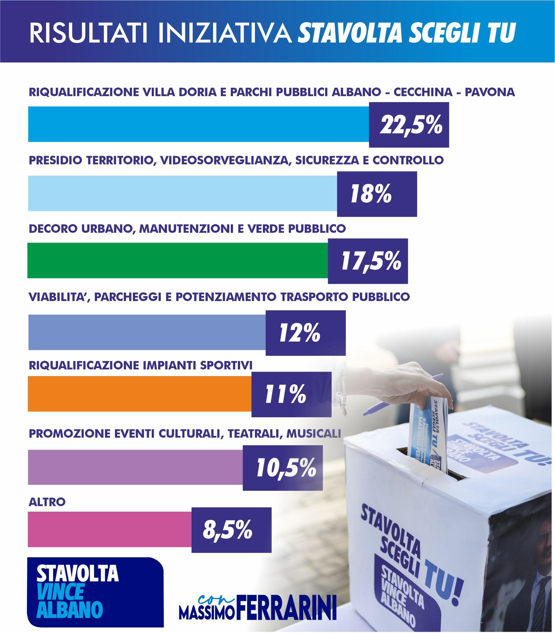Questi i risultati in percentuale della mobilitazione “Stavolta Scegli Tu”, promossa dal candidato Sindaco del centrodestra e dei civici riformisti di Albano Laziale Massimo Ferrarini, in cui i cittadini di Albano, Cecchina, Pavona, Cancelliera e Mole, sono stati chiamati ad individuare, mediante la compilazione di un modulo distribuito nelle piazze e online, quelli che secondo loro sono i temi prioritari e più sentiti in città.