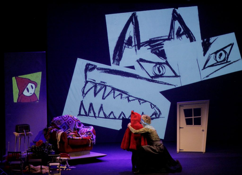 La scenografia si svela di volta in volta, un’artista disegna intorno alla nonna in diretta con la lavagna luminosa, la casa, il letto, il bosco, la strada, le colline, il cielo e tante altre sorprese. Adatto dai 3 agli 8 anni.